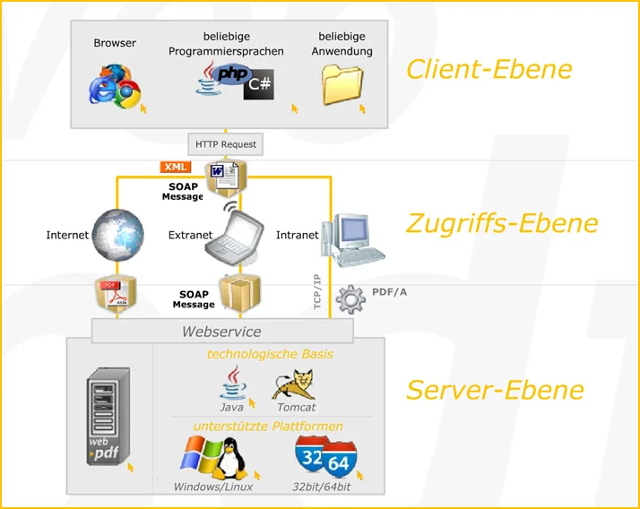 The webPDF server delivers its solutions in the form of individual web services. These web services are implemented in Java and provided through an embedded Tomcat server.