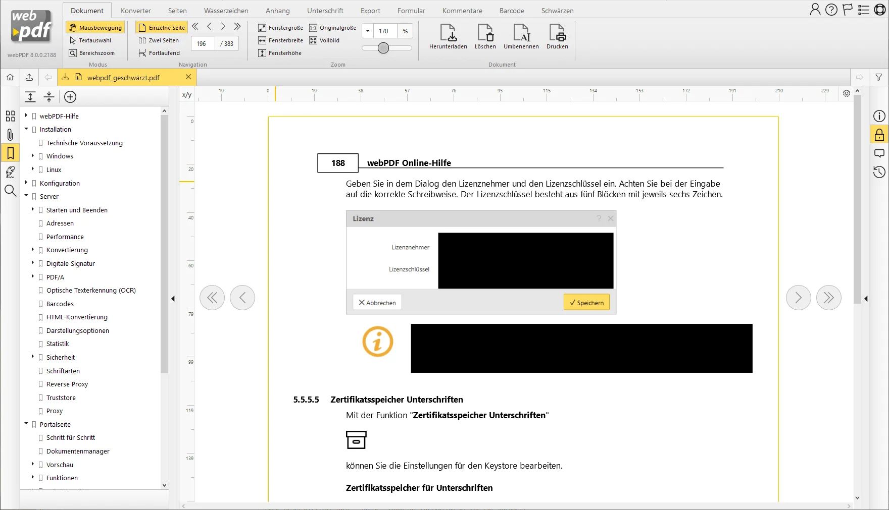Im webPDF-Portal kann einfach in einem PDF-Dokument ein Bereich markiert und dieser dann geschwärzt werden, so dass die Inhalte bei der Weitergabe eines PDF-Dokuments ausgeblendet und komplett entfernt sind. Dabei können textliche Inhalte genauso wie Grafiken mit der Funktion „Schwärzen" bearbeitet werden.